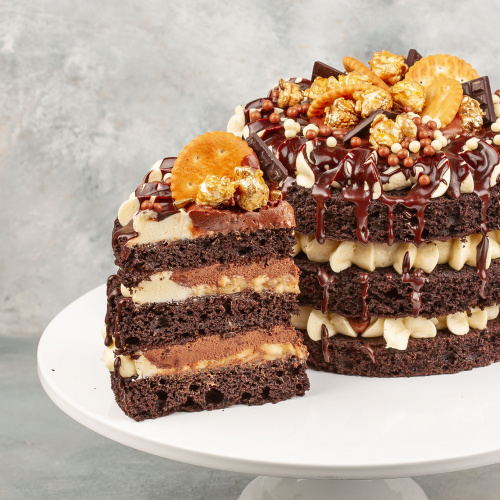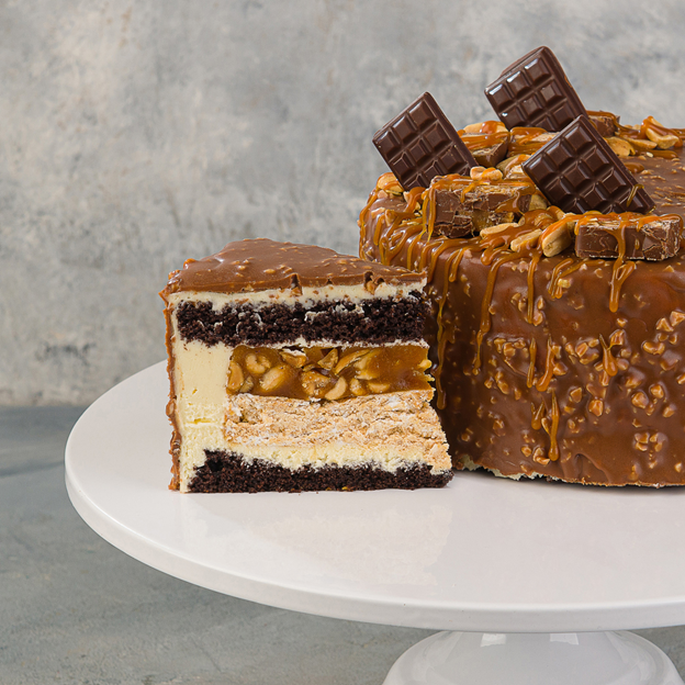 сникерс. Такой торт сочетает в себе мягчайший и сочный шоколадный бисквит, ароматную сливочную карамель, прожаренный арахис и деликатный сырный крем. По вкусу напоминает одноименный батончик;