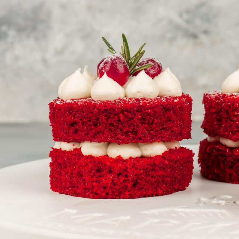 Этот десерт можно приготовить не только в виде торта, но и порционно. Из большого бисквитного коржа красного цвета круглой формой вырежьте круги и сделайте прослойку из крем-чиза. Сверху каждое пирожное можно украсить серебристыми кондитерскими шариками, присыпать золотистой съедобной фольгой. Или создайте украшение в рождественском стиле – добавьте ягоды брусники и листья мяты.