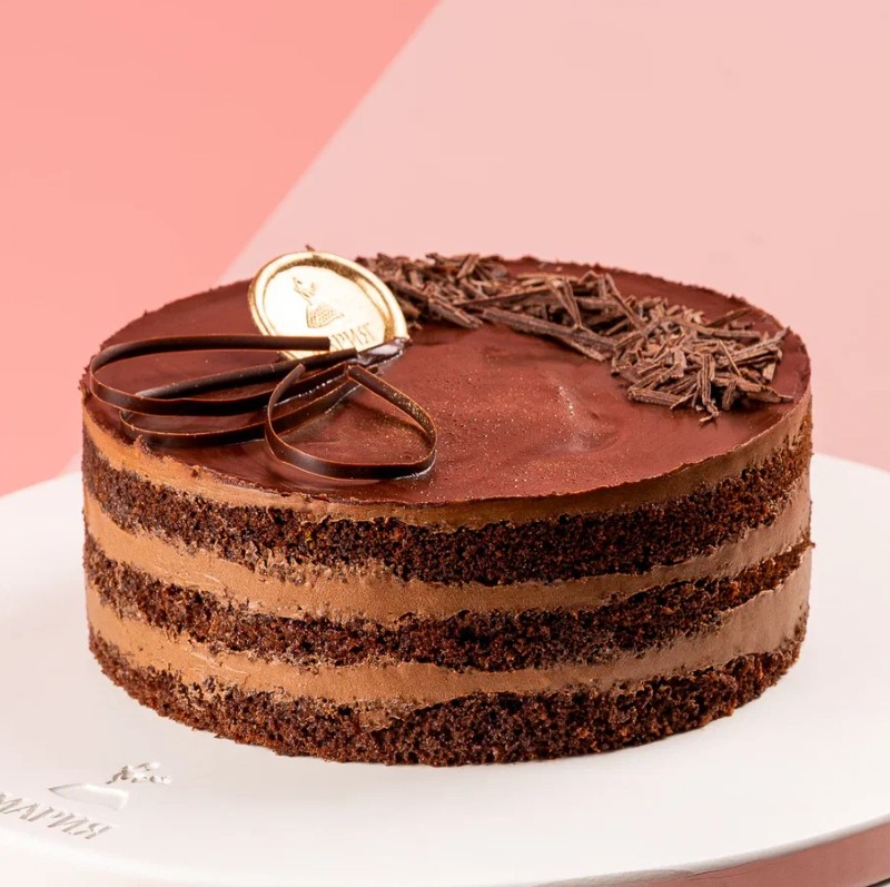 Воздушный шоколадный бисквит, нежный сливочный крем с варёной сгущёнкой, шоколадный декор, шоколадная глазурь.