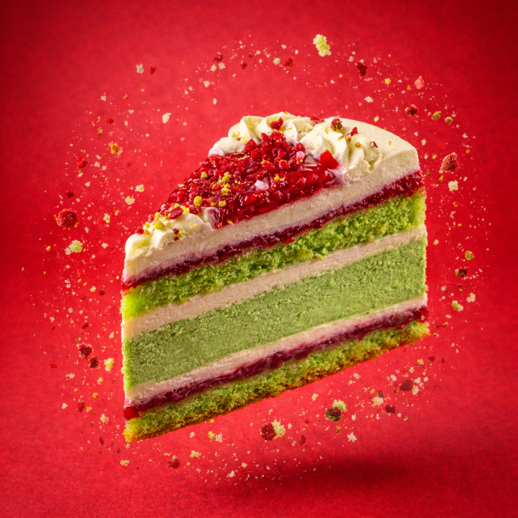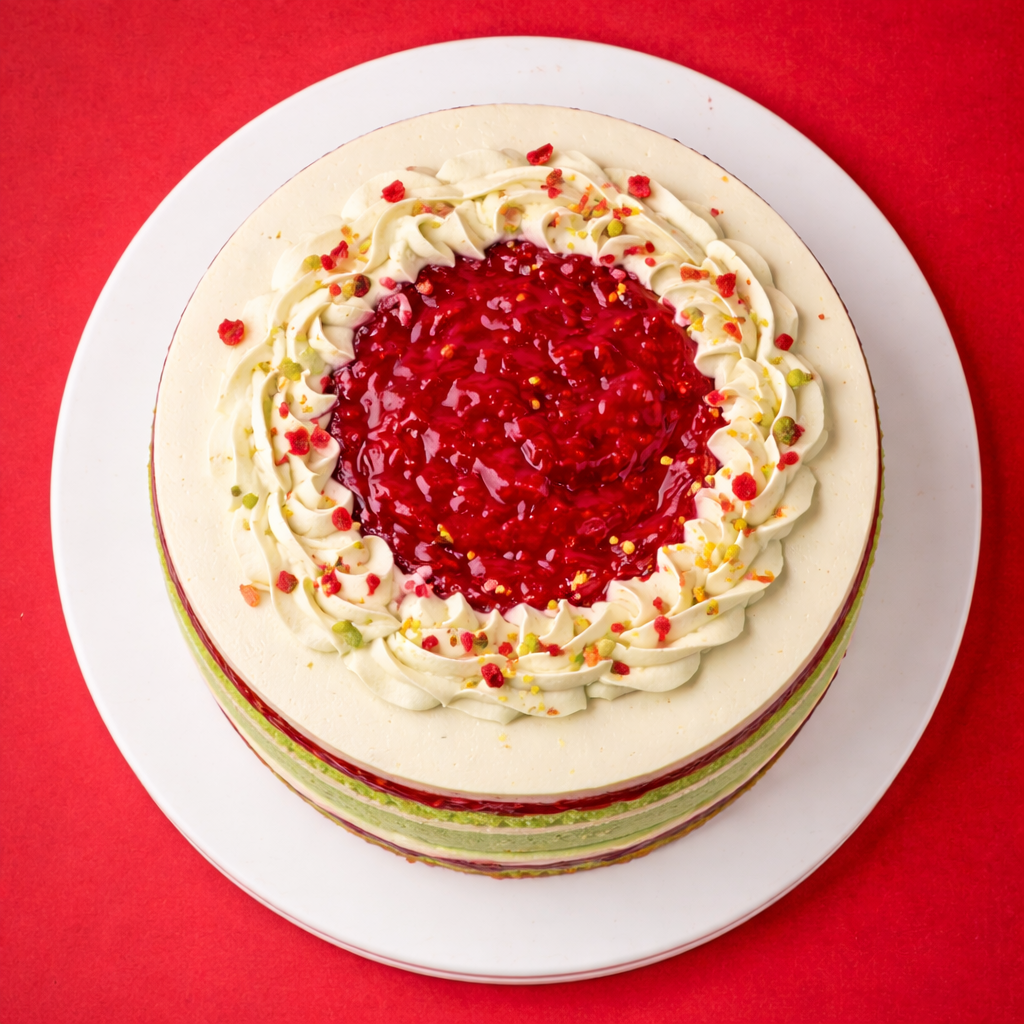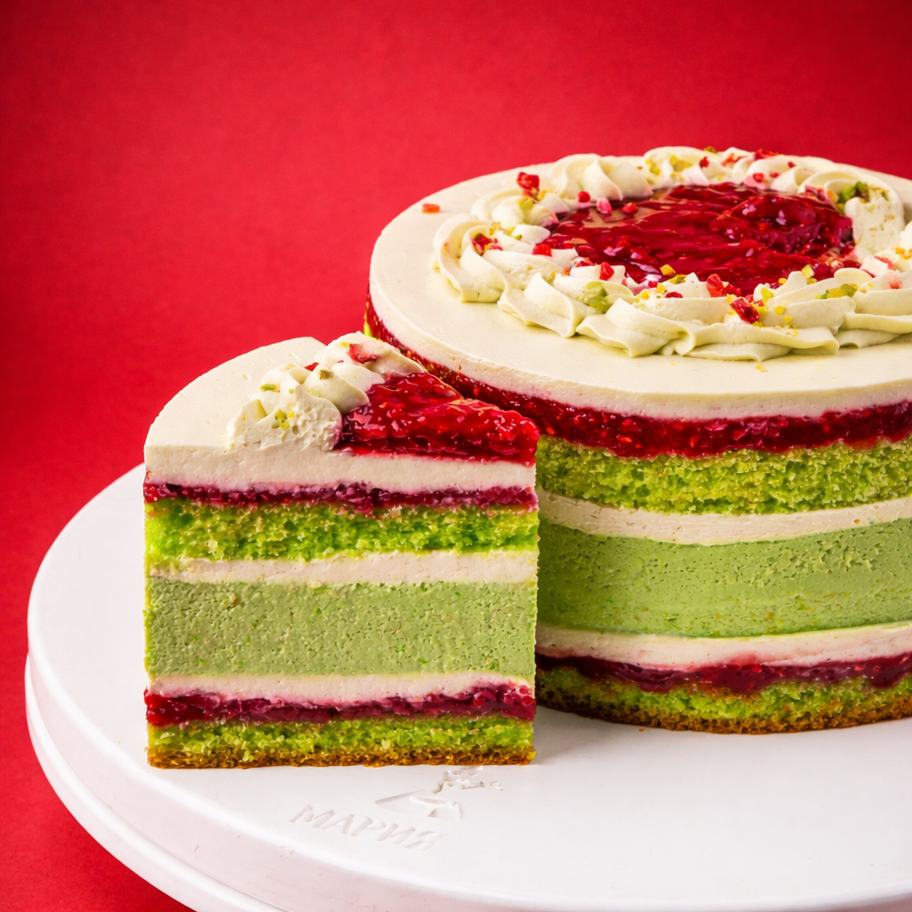 Смесь для бисквитов, яйцо, масло растительное, вода, краситель пищевой/ сыр творожный, сливки, фисташковая паста, желатин, шоколад, малина, сахар, молоко, малина сублимированная.