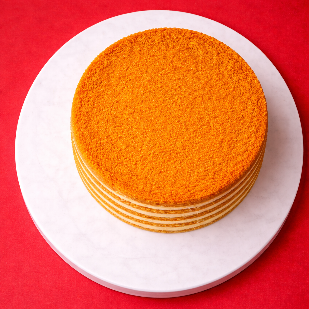 Тонкие коржи воздушного заварного медового теста, пропитанные нежным кремом из творожного сыра, сливочного масла и сгущёнки.