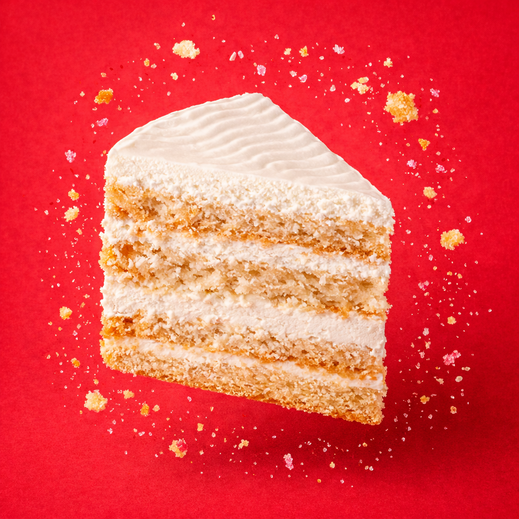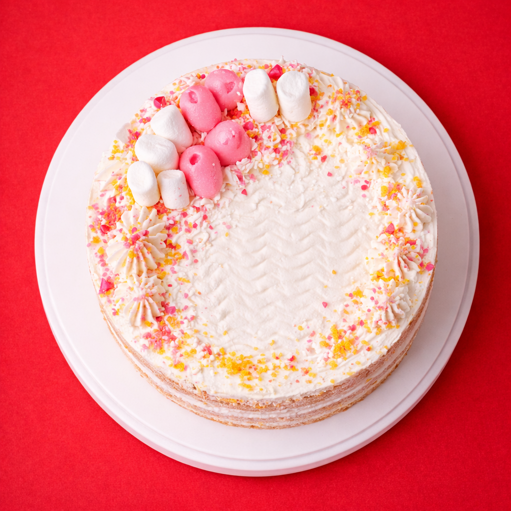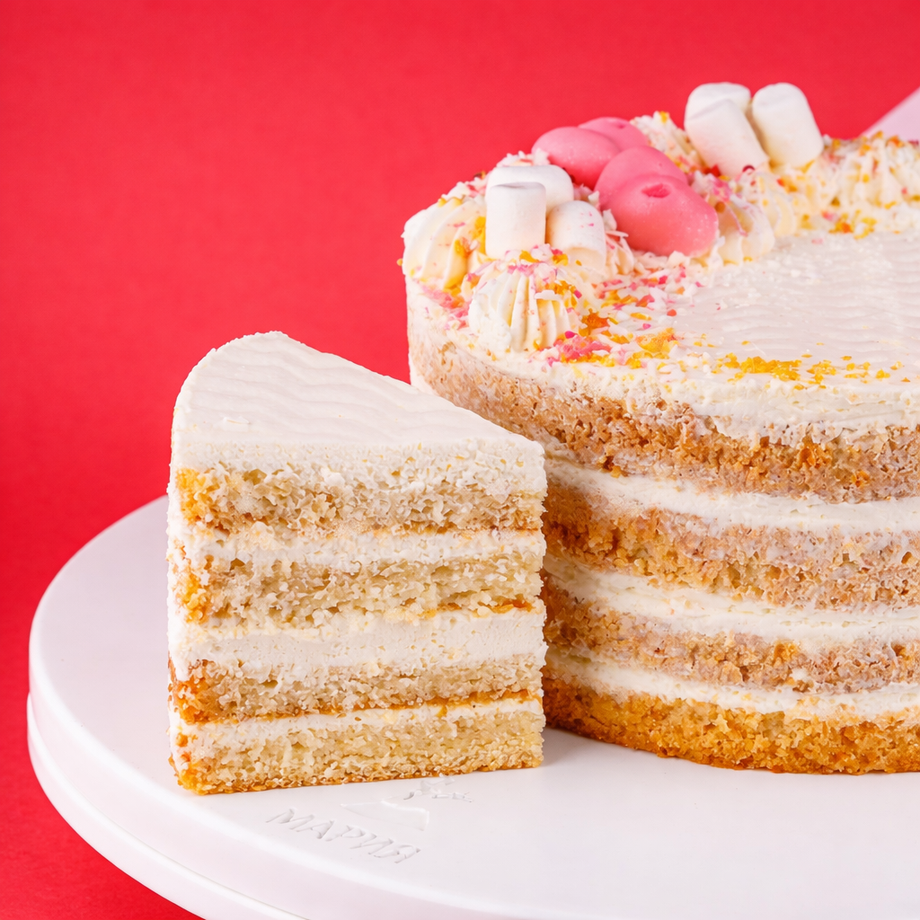 Мука в/с, сахар, яйцо 1С, масло сливочное 82%, молоко сгущенное, сливки 33%, ванилин, крахмал, кокосовая стружка, шоколад, маршмеллоу, золотая посыпка, крошка лавандовая.