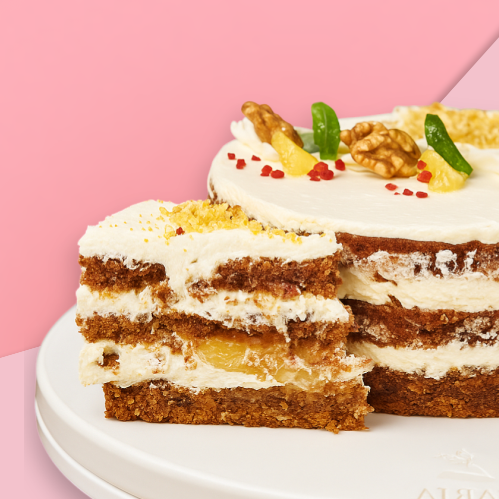 Яйцо,сахар, мука, разрыхлитель, молоко питьевое, масло растительное, морковь, грецкий орех, кокосовая стружка, ананас, корица/ сливки, масло, сыр творожный, сахарная пудра, гель.