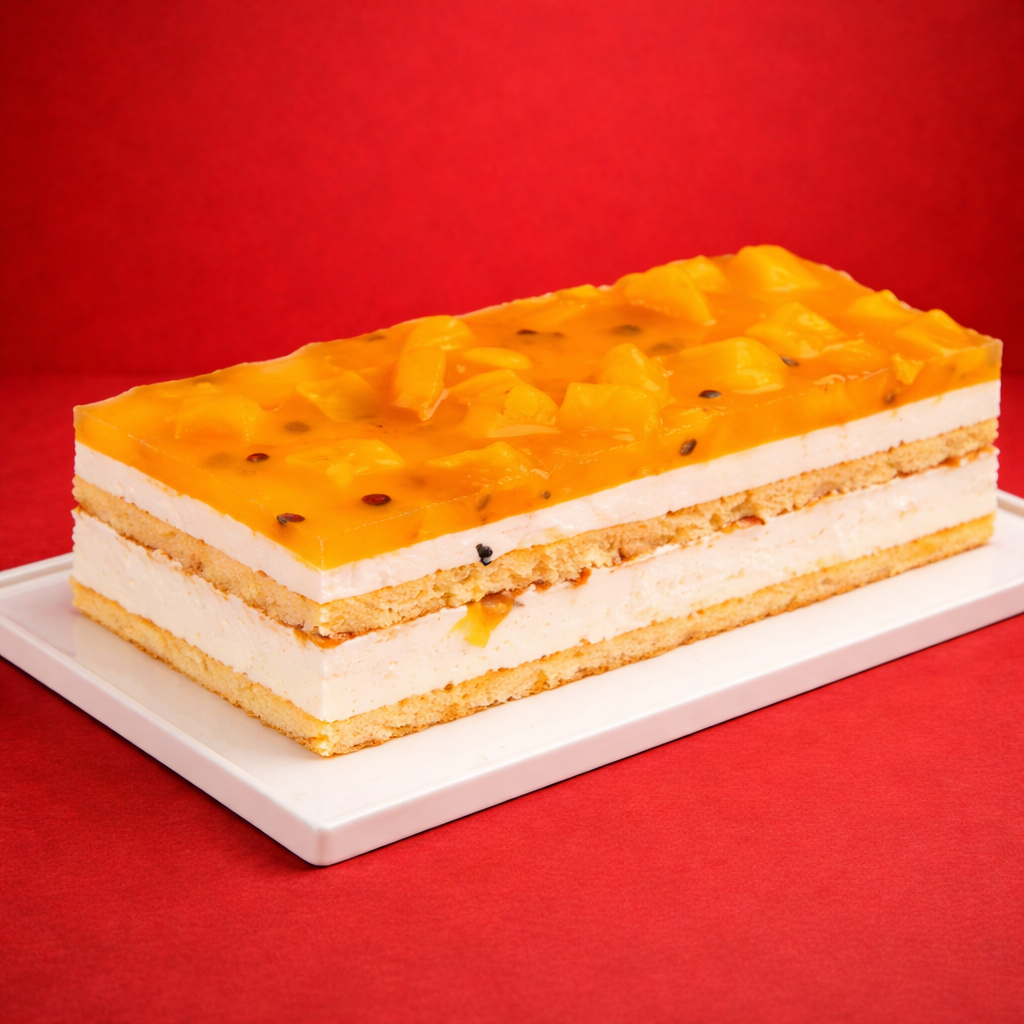 Сердце торта наполнено конфи из спелого манго, дарящим сладость и насыщенность, а кубики манго добавляют текстуру и свежесть. Завершает этот шедевр желе манго-маракуйя, которое придаёт изысканный фруктовый акцент и легкую кислинку, создавая гармонию вкусов.