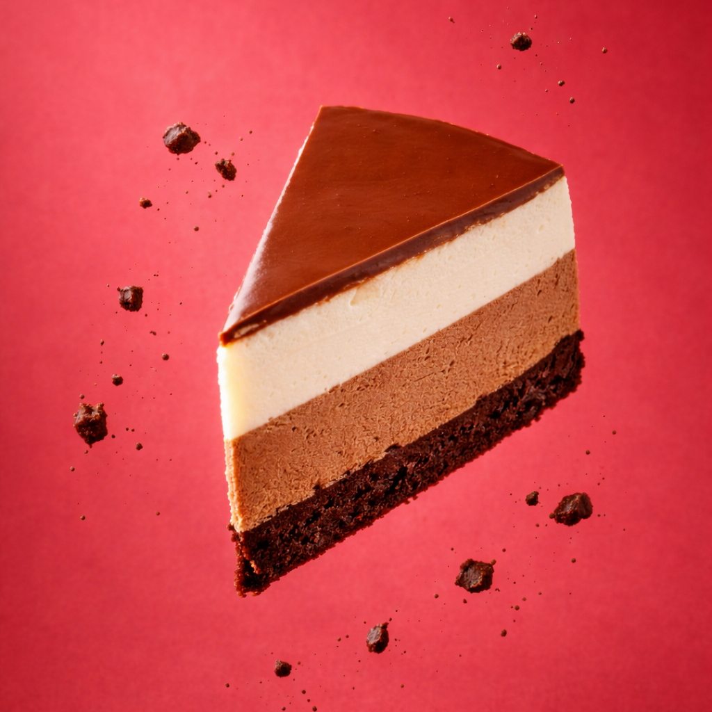 Средний слой - легкий мусс из темного и молочного шоколада. Верхний слой – утонченный воздушный мусс из белого бельгийского шоколада
