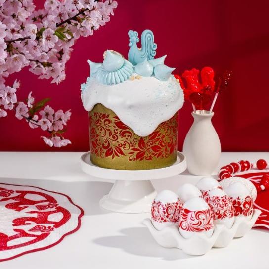 Нежное сдобное тесто с апельсиновыми цукатами и изюмом, пропитанный апельсиновым сиропом, оформлен безе, шоколад, сахарной помадкой, драже, пирожное картошка в виде яйца, пищевой краситель.