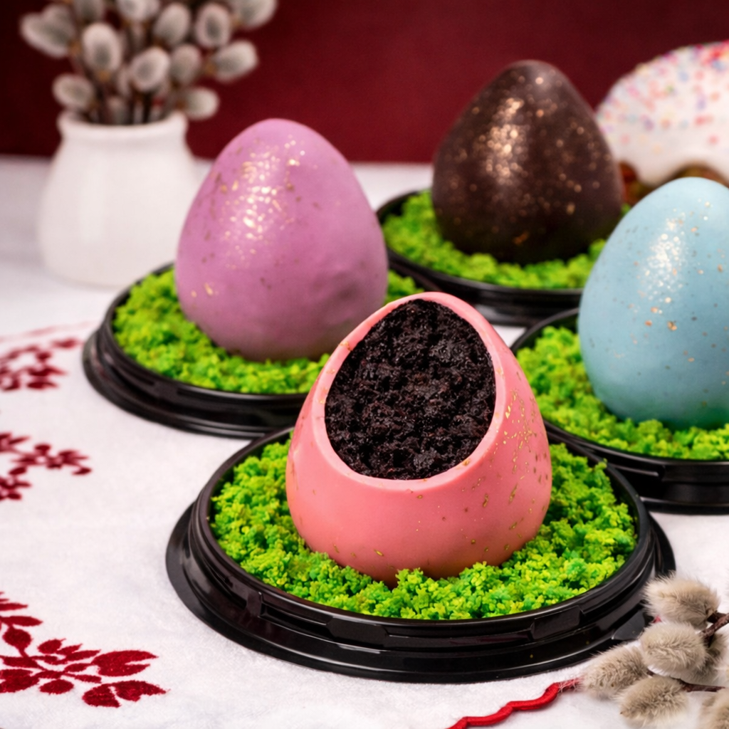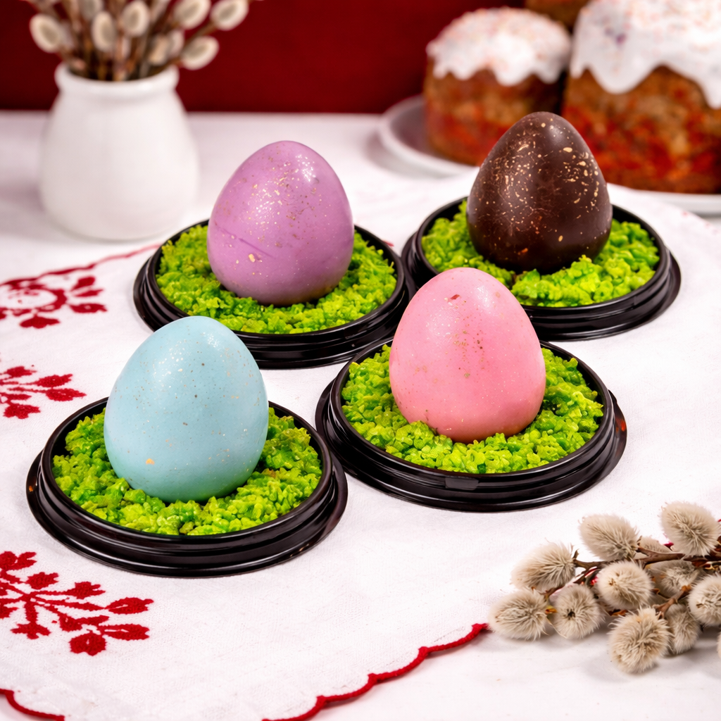 Пирожное картошка в форме яйца, облитое шоколадом и золотым кандурином, стоящее на зеленой крошке.