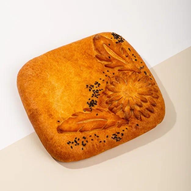 Воздушное рублено-дрожжевое тесто, начинка с картофелем, грибами, беконом и луком, посыпанная кунжутом.